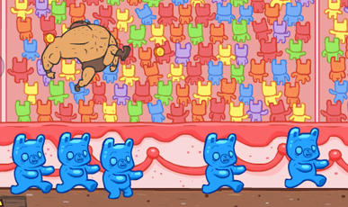 Så skal der bodyslammes nogle gummibamser. Her gælder det om at fyre bisonoksen afsted så langt som muligt og samle på mønter undervejs. Pengene kan bruges til at købe opgraderinger i shoppen for, så du kan komme endnu længere. Du bruger musen til at styre.