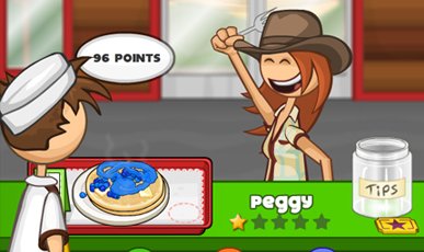 Hjælp Prudence og Cooper med at styre Papa's pandekagehus. Tag imod ordrer fra kunderne og lav pandekagerne efter deres ønsker. Du bruger musen til at styre.